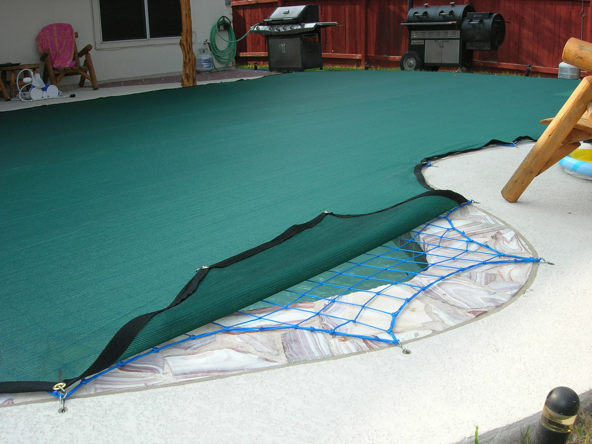 Our custom pool covers can stretch and withstand a considerable amount of weight and are held tightly with just the tensile strength of the pool cover knitting, which reduces the risk of someone becoming entangled in case of a fall. As previously mentioned, since other pool covers are only held with sandbags, water-filled bags, or large lawn nails, they have a very high potential of tangling an animal or human in the cover, which can be potentially dangerous if not fatal.